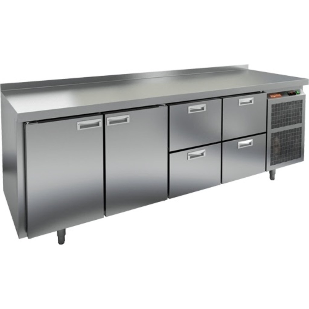Стол оснащен двумя глухими дверями и четырьмя выдвижными ящиками, что обеспечивает удобный доступ к продуктам и рациональное использование внутреннего пространства. Оборудование идеально подходит для предприятий общественного питания.
