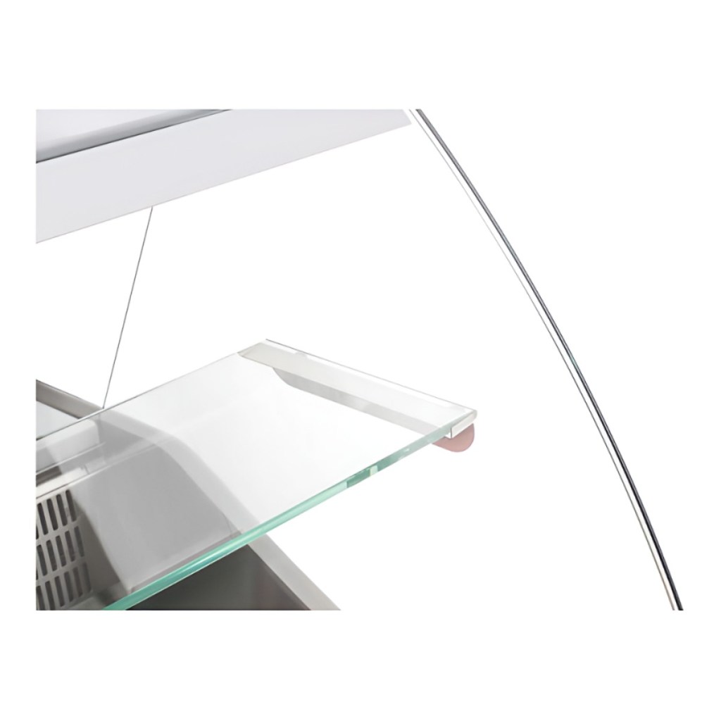 Витрина оснащена изогнутым фронтальным стеклом, обеспечивающим отличный обзор продукции, люминесцентной подсветкой экспозиционной зоны и вместительной охлаждаемой камерой для хранения товарного запаса. Экспозиционная и рабочая поверхности выполнены из нержавеющей стали, боковые панели изготовлены из ударопрочного ABS-пластика, а теплоизоляция выполнена из пенополиуретана, что способствует эффективному сохранению холода.